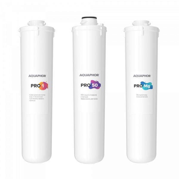 • В комплект входит комбинация из трех сменных модулей Pro 1, Pro 50 и Pro Mg для обратноосмотической системы Аквафор Osmo Pro 50. Производительность мембраны Pro 50 составляет 190 литров (50 галлонов) в сутки.*